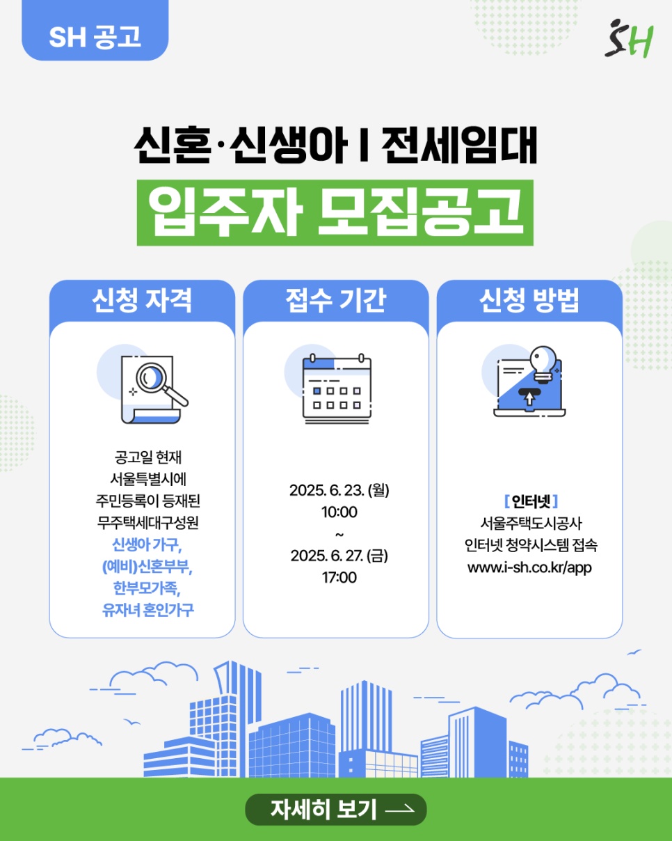 새로운 가정을 꾸리거나 소중한 아기를 맞이하는 신혼부부 및 신생아 가구에게 가장 큰 고민 중 하나는 바로 '안정적인 보금자리' 마련일 것입니다. 높은 전세가와 복잡한 입주 절차 속에서 내 집 마련의 꿈은 멀게만 느껴지기도 합니다. 하지만 서울주택도시공사(SH)에서 발표한 '2025년 신혼·신생아Ⅰ 전세임대 입주자 정기모집공고'는 이러한 어려움을 겪는 분들에게 단비와 같은 소식이 될 것입니다.