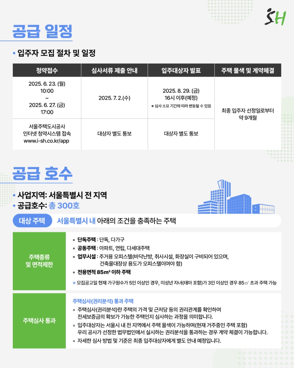 - 사업 지역: 주로 서울시 등 모집 공고에 명시된 지역. (본 공고는 서울주택도시공사(SH)의 공고문입니다.)