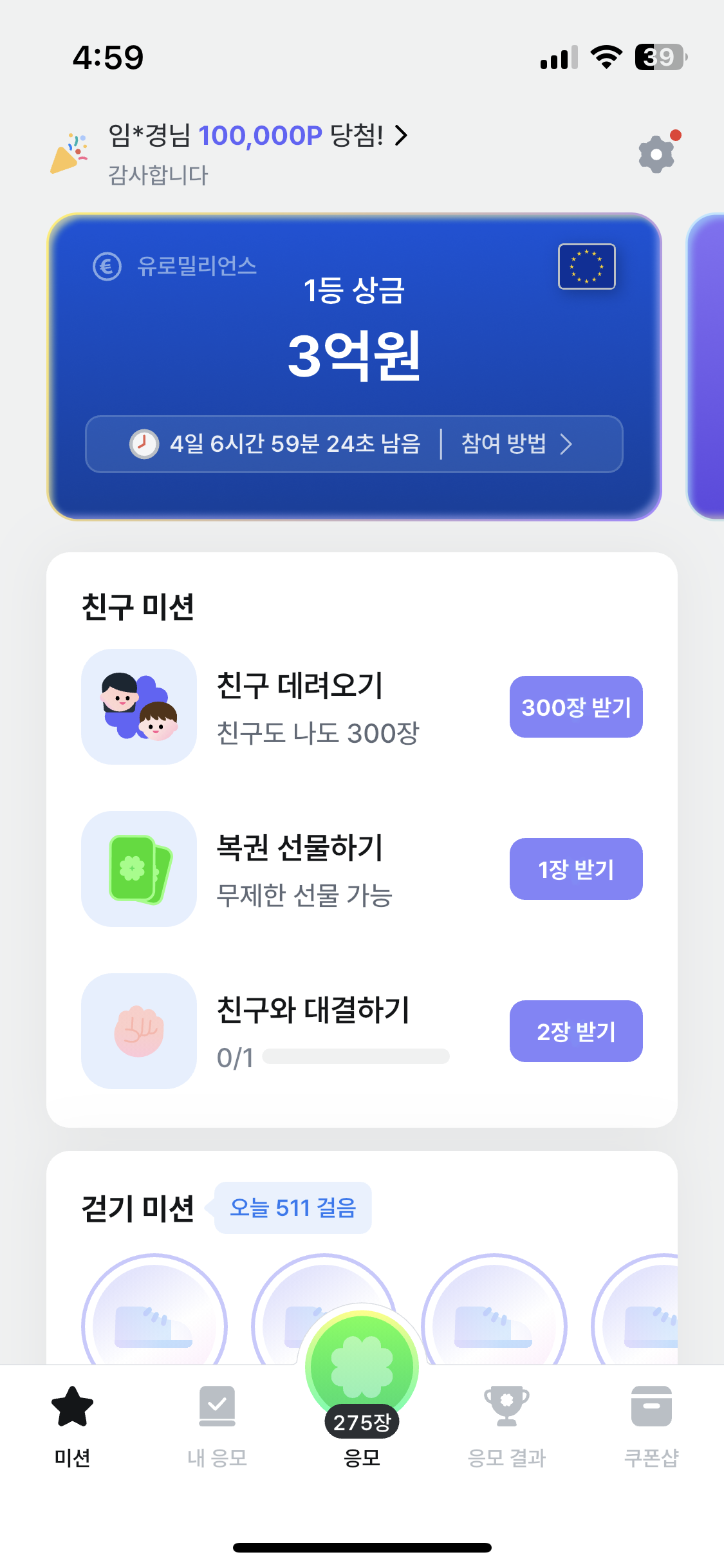 즉, 걸음 수만 채워도 자동으로 응모권이 늘어나고, 당첨 여부도 앱에서 바로 확인할 수 있습니다.