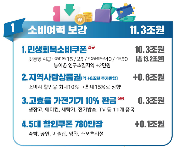 총 11.3조원 규모의 '소비여력 보강' 항목 중, '민생회복소비쿠폰'이 10.3조원을 차지합니다. 이는 가계의 소비 여력을 직접적으로 늘려주는 핵심 정책입니다.