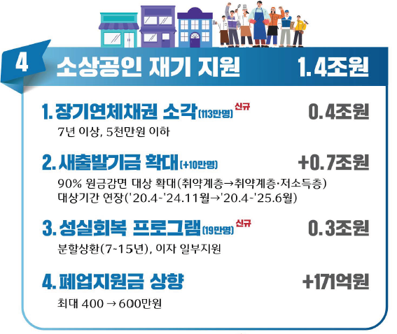 - 장기연체채권 소각 (0.4조원): 7년 이상 연체된 5천만원 이하 채무를 가진 113만명에 대한 채권 소각.