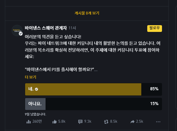현재 세계 1위 암호화폐 거래소인 **바이낸스(Binance)**에서 파이코인의 상장 관련 투표가 진행되고 있습니다.