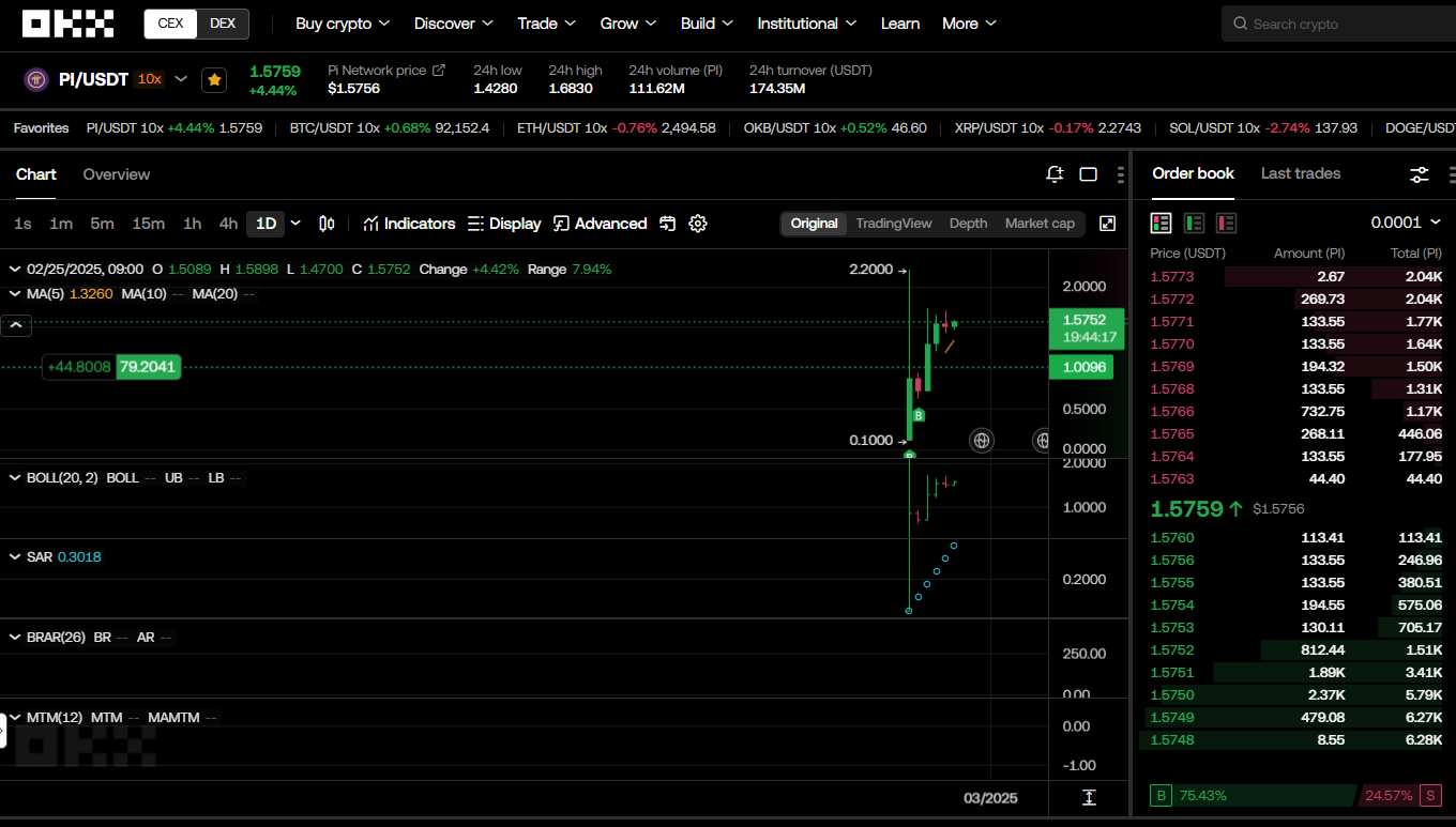 ✅ 파이코인 현재 가격은 약 $1.524로, 상장 후 최저점 대비 100% 상승