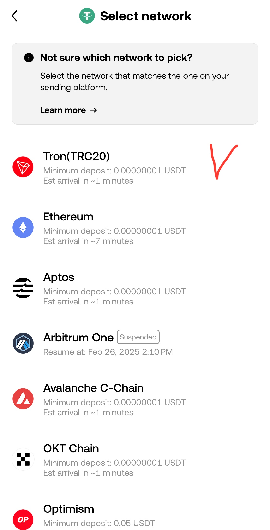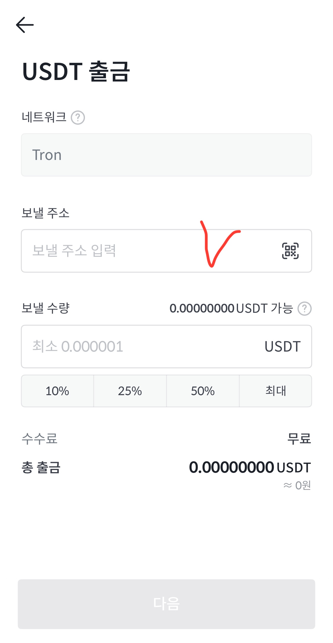 - 네트워크를 TRC20 또는 ERC20으로 선택