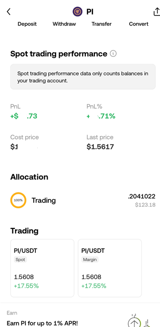 - 거래 메뉴에서 "PI/USDT" 선택