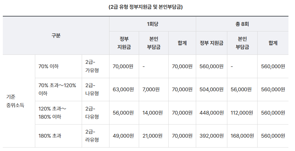서비스는 1급 유형과 2급 유형으로 나뉘며, 각 유형별로 1회 상담 비용이 책정되어 있습니다. 1급 유형은 회당 8만원, 2급 유형은 회당 7만원입니다. 이 비용은 정부 지원금과 본인 부담금으로 구성됩니다. 본인 부담률은 기준 중위소득에 따라 차등 적용되어, 소득 수준에 따라 0%부터 최대 30%까지 본인이 부담하게 됩니다. 이는 경제적인 부담 없이 심리 상담을 받을 수 있도록 하기 위함입니다.