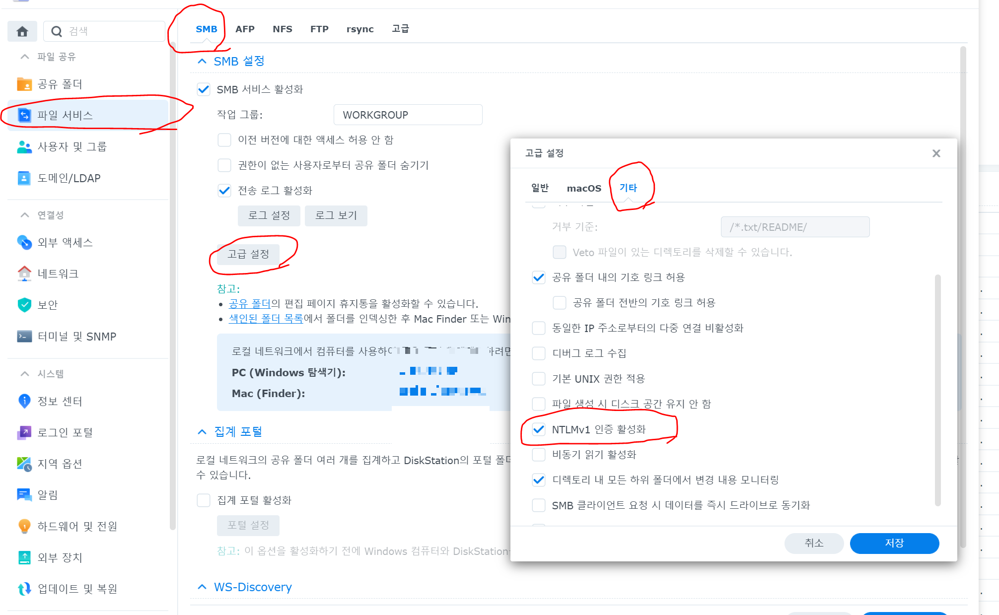 NTLMv1 인증 활성화를 켜놓으면 접속이 안되던 컴퓨터에서 네트웍 접속이 되었다.
